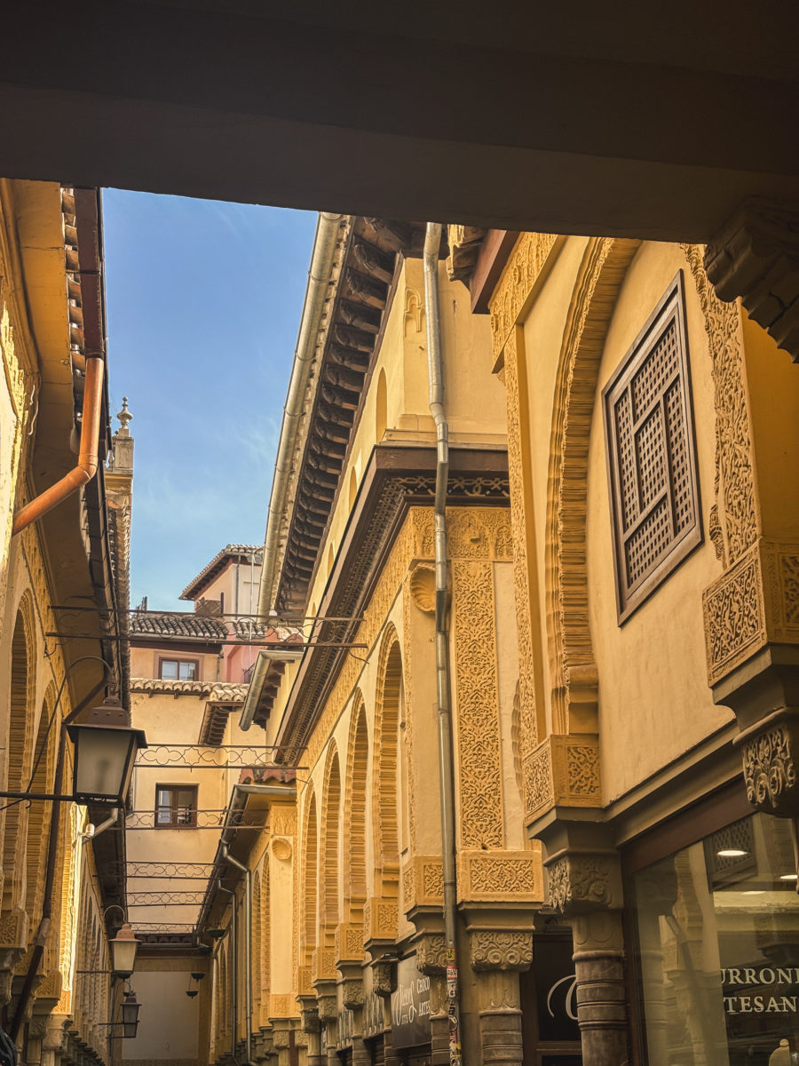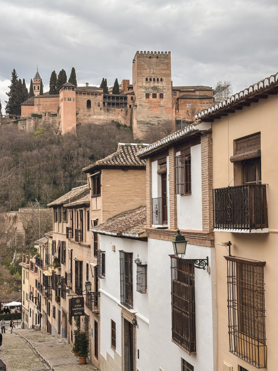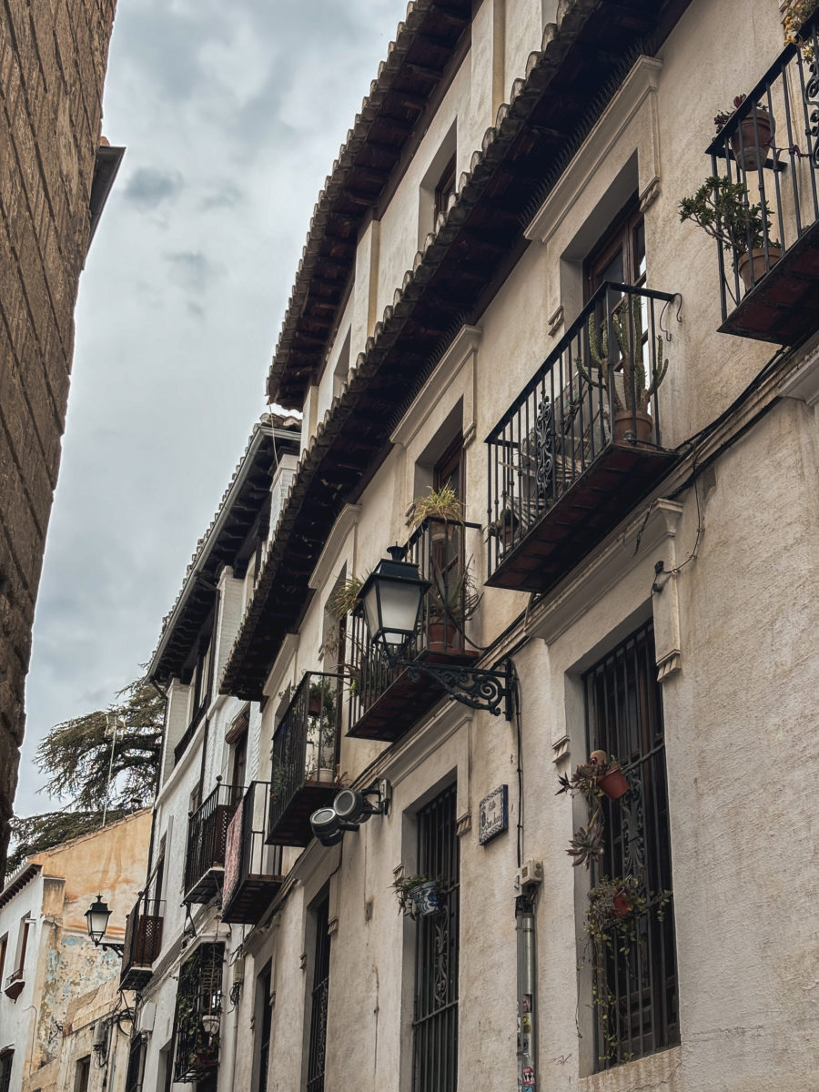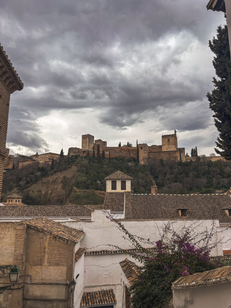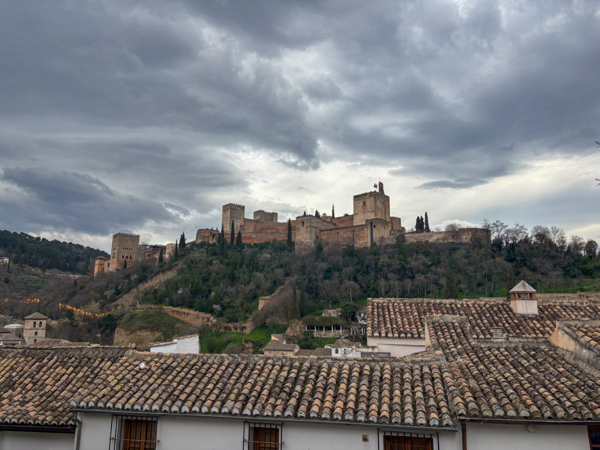 Le quartier est également parsemé de miradors, ces points de vue spectaculaires sur l’Alhambra. Malheureusement, la météo n’était pas de notre côté, et le spectacle tant espéré nous a échappé. Un rayon de soleil ou un coucher doré aurait révélé toute la splendeur de la Rouge… mais non, il a plu. Alors, faute de lumière dorée, nous avons savouré la ville autrement, de café en café, à l’abri des gouttes, dans le cœur vibrant de Grenade.