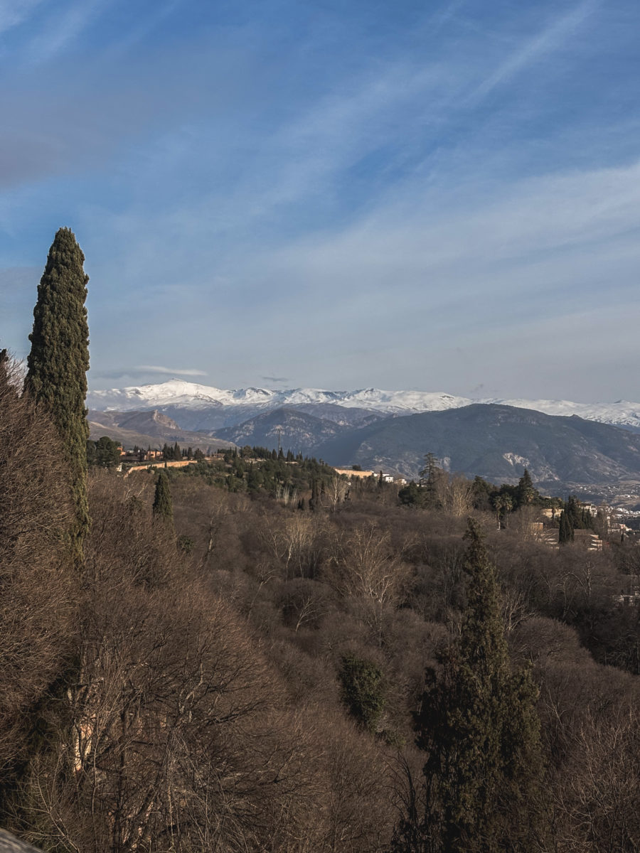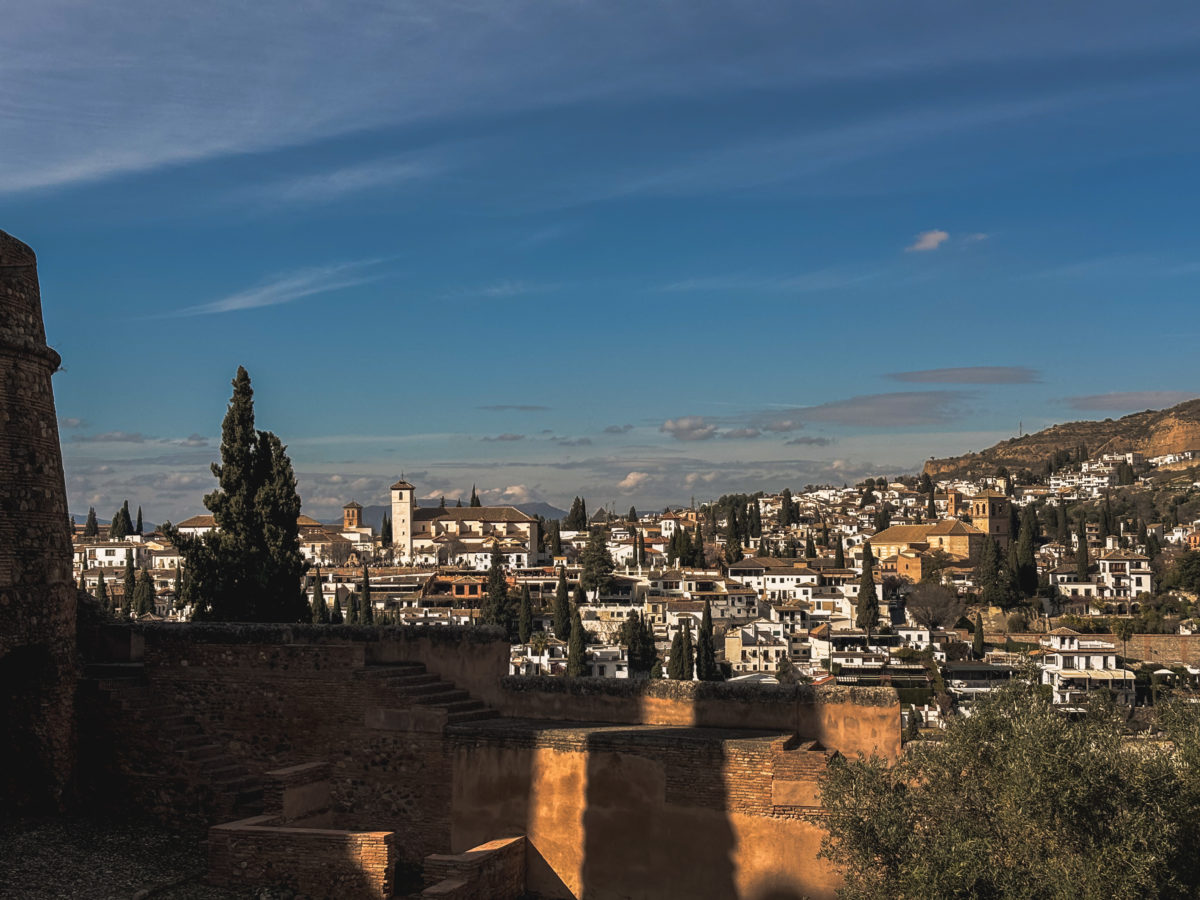 Depuis l’Alhambra, les points de vue ne manquent ainsi pas. D’un côté, la ville de Grenade s’étale en contrebas : ruelles blanches, clochers, et l’Albaicín, l’ancien quartier mauresque, qui serpente sur les collines. Les toits de tuiles ocre contrastent joliment avec le vert profond des cyprès et des jardins, même en plein hiver.
