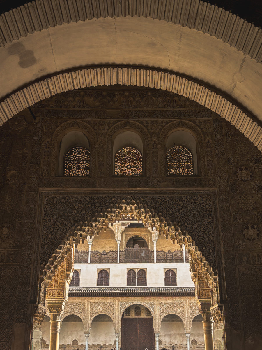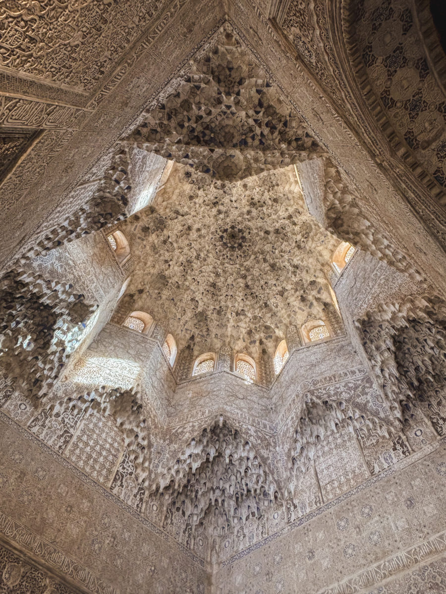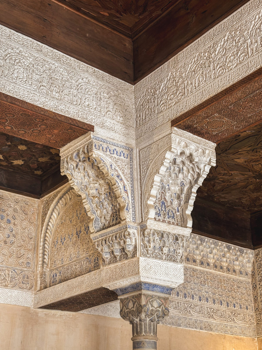 À l’Alhambra, les arabesques couvrent les murs avec une précision remarquable, formant des motifs répétés qui donnent une impression d’harmonie et d’équilibre. La géométrie rigoureuse se mêle aux formes végétales stylisées, tandis que les inscriptions sculptées rappellent l’importance de l’écriture dans l’architecture nasride. Les stucs finement travaillés, les arcs délicatement découpés et les muqarnas aux plafonds témoignent d’un savoir-faire exceptionnel et d’un grand souci du détail. Chaque élément décoratif participe à une architecture pensée pour être contemplée de près, où la richesse ne réside pas dans la monumentalité, mais dans la finesse et la maîtrise de l’ornement.