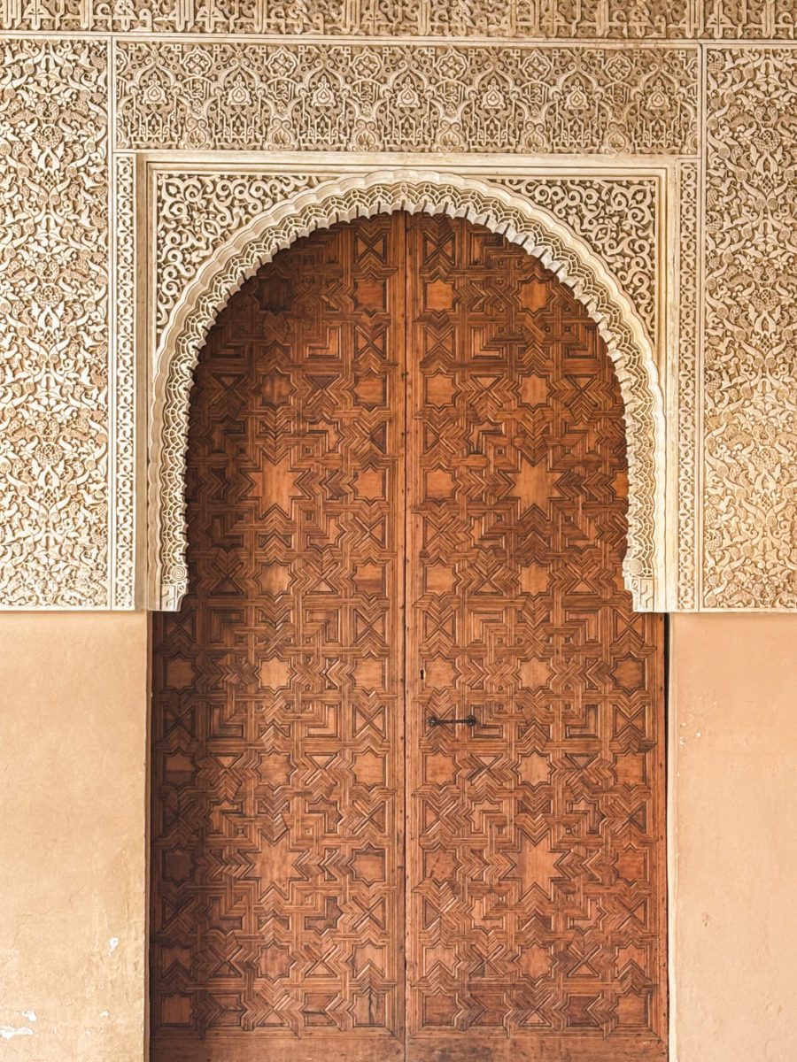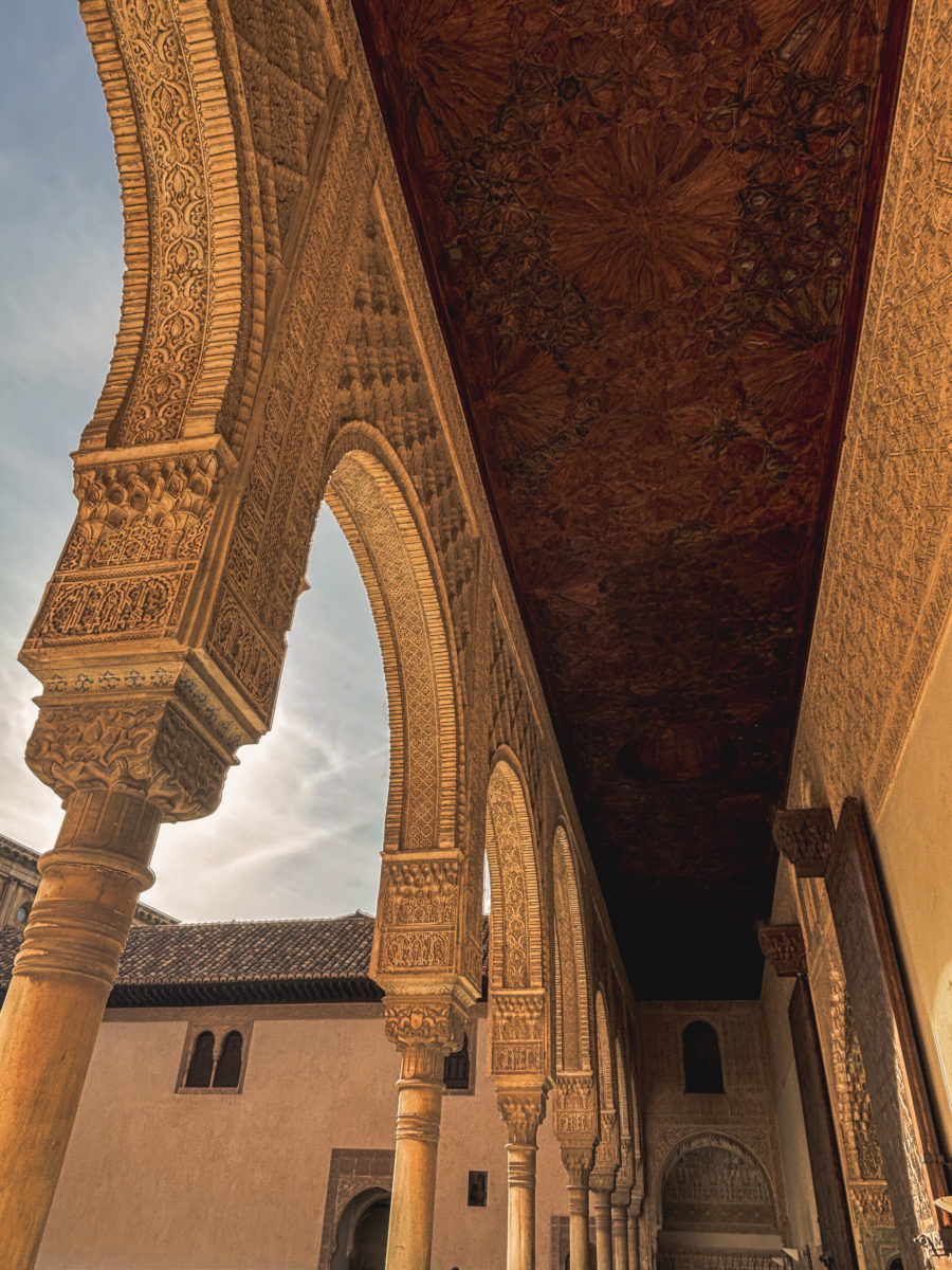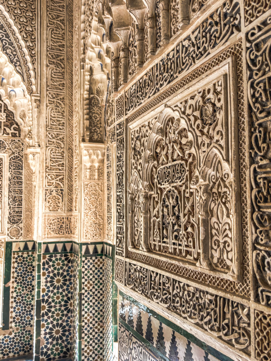 À l’Alhambra, les arabesques couvrent les murs avec une précision remarquable, formant des motifs répétés qui donnent une impression d’harmonie et d’équilibre. La géométrie rigoureuse se mêle aux formes végétales stylisées, tandis que les inscriptions sculptées rappellent l’importance de l’écriture dans l’architecture nasride. Les stucs finement travaillés, les arcs délicatement découpés et les muqarnas aux plafonds témoignent d’un savoir-faire exceptionnel et d’un grand souci du détail. Chaque élément décoratif participe à une architecture pensée pour être contemplée de près, où la richesse ne réside pas dans la monumentalité, mais dans la finesse et la maîtrise de l’ornement.