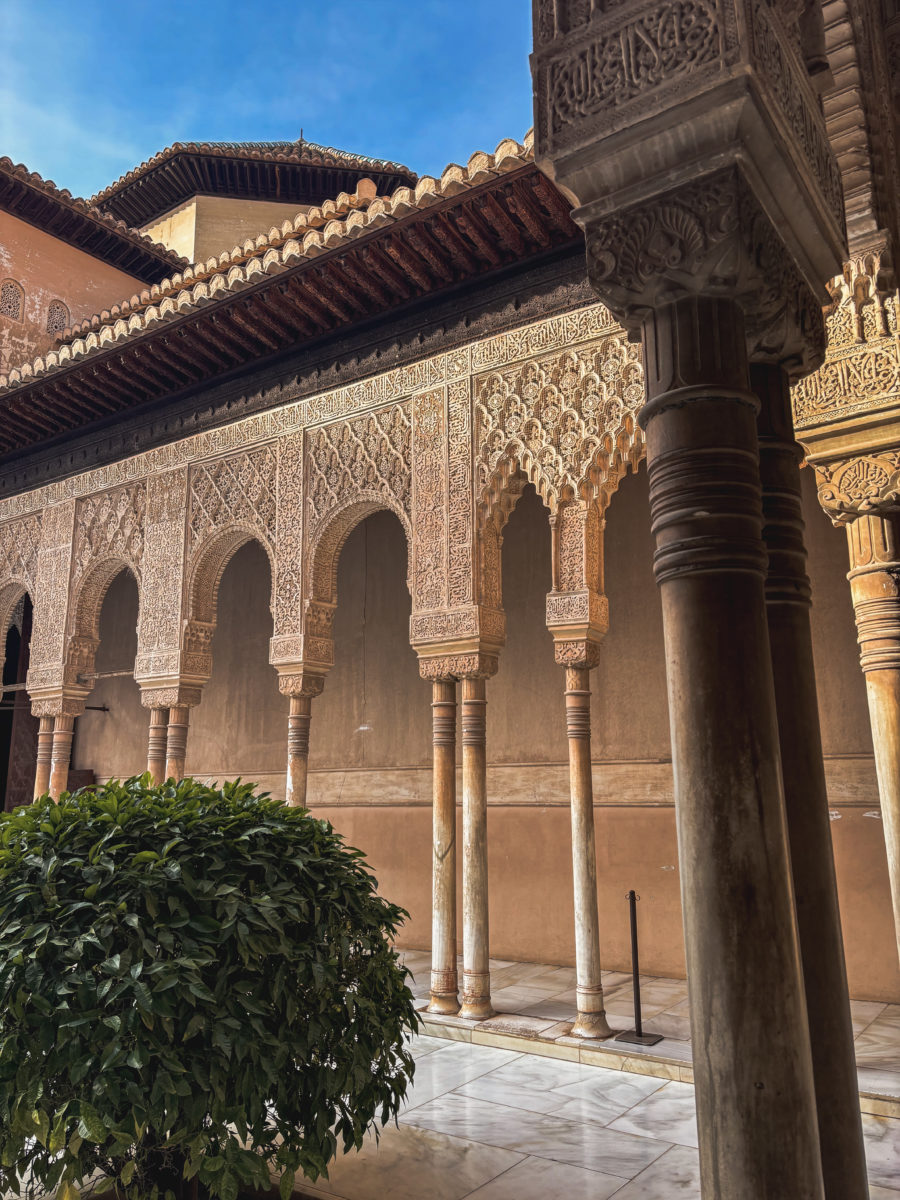 C’est le cœur de l’Alhambra. Ce palais est célèbre pour ses décorations intérieures raffinées. Les murs sont recouverts de stucs délicats, de mosaïques colorées et de calligraphies arabes qui racontent des histoires anciennes. La Cour des Lions, avec sa fontaine centrale entourée de douze lions de marbre, est l’un des symboles les plus emblématiques de l’Alhambra.