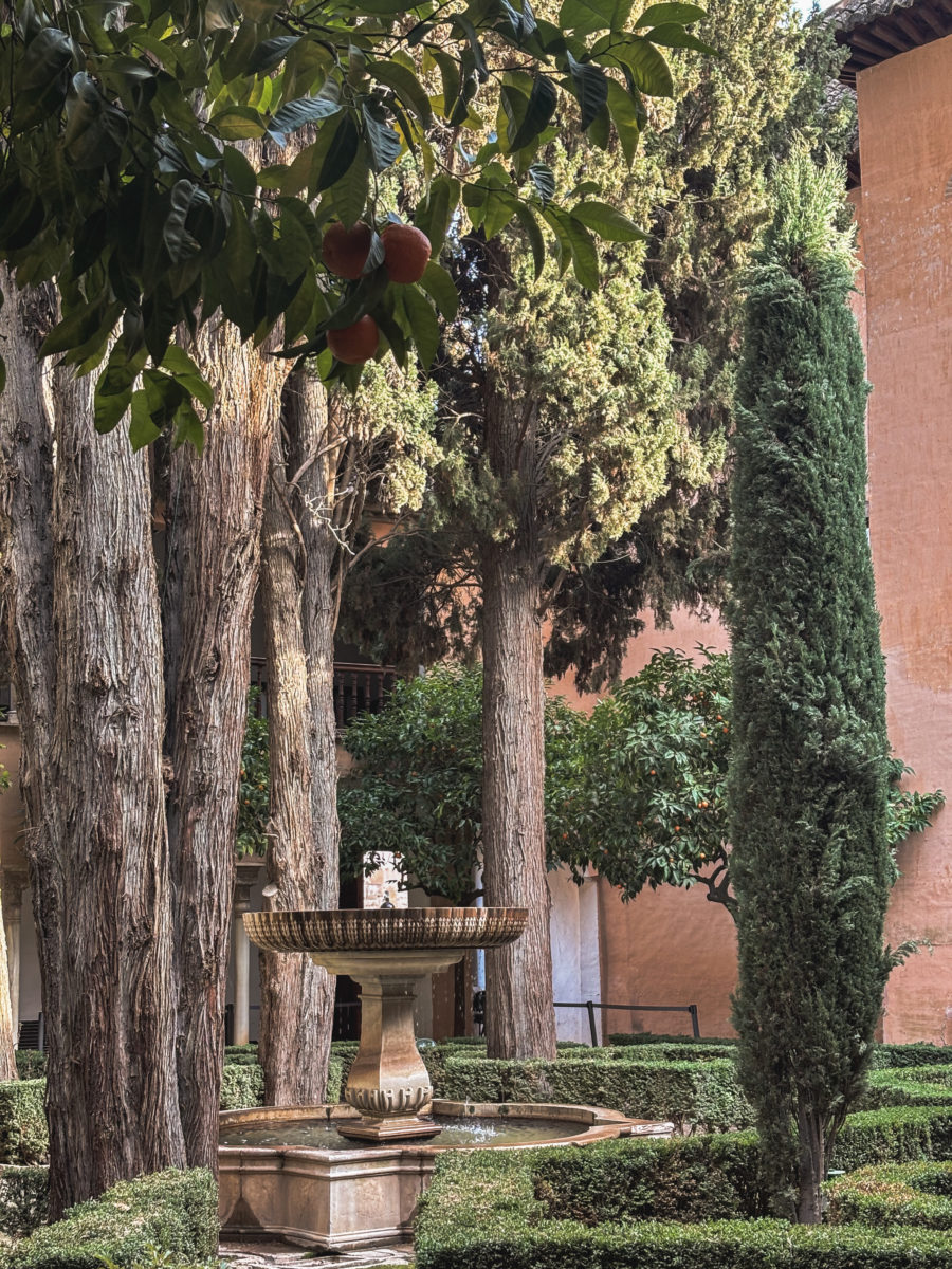 Juste à côté de l’Alhambra s’étendent les jardins du Généralife, souvent décrits comme un véritable paradis sur terre. C’était autrefois le refuge des émirs, un lieu où ils venaient se reposer à l’abri de la chaleur estivale. Allées ombragées, bassins miroitants, parterres fleuris… tout y respire la sérénité et la beauté hors du temps.