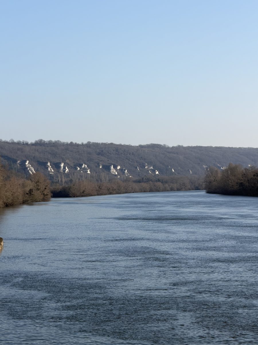 Perched above a wide bend in the Seine, La Roche-Guyon stands like a stone sentinel. Its castle, literally carved into the rock, dominates the village, though it remains inaccessible to us, closed for winter. That is also part of traveling between Christmas and New Year: shuttered windows, silent shops, nearly deserted streets. Yet far from disappointing, this quiet gives the place an added charm. With only a few hundred inhabitants, the village seems frozen in time, nestled at the foot of the castle as if time itself had paused.