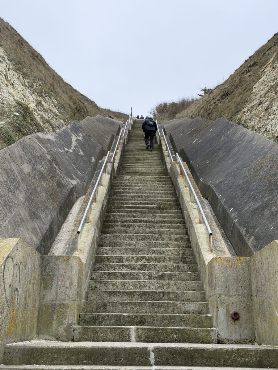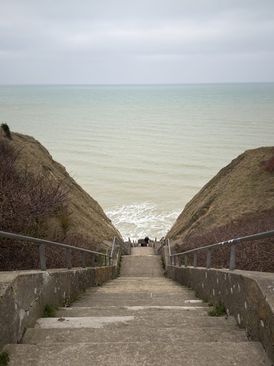 Rebuilt in concrete in 1954, the staircase now forms a long ribbon of steps threading between chalk walls, austere and almost monumental. As you descend, the sea reveals itself gradually. Each landing brings you closer to the shore and to the layered history etched into the landscape.