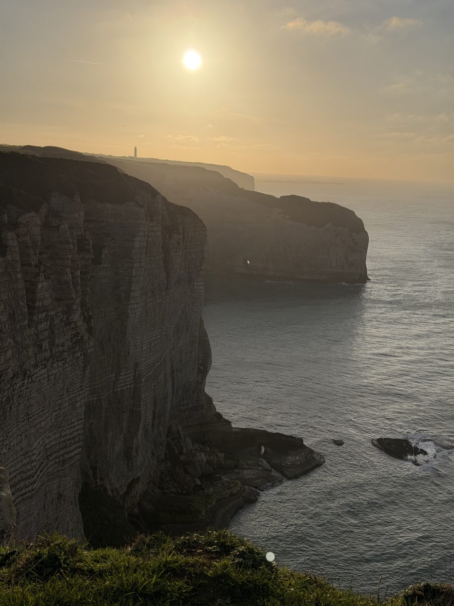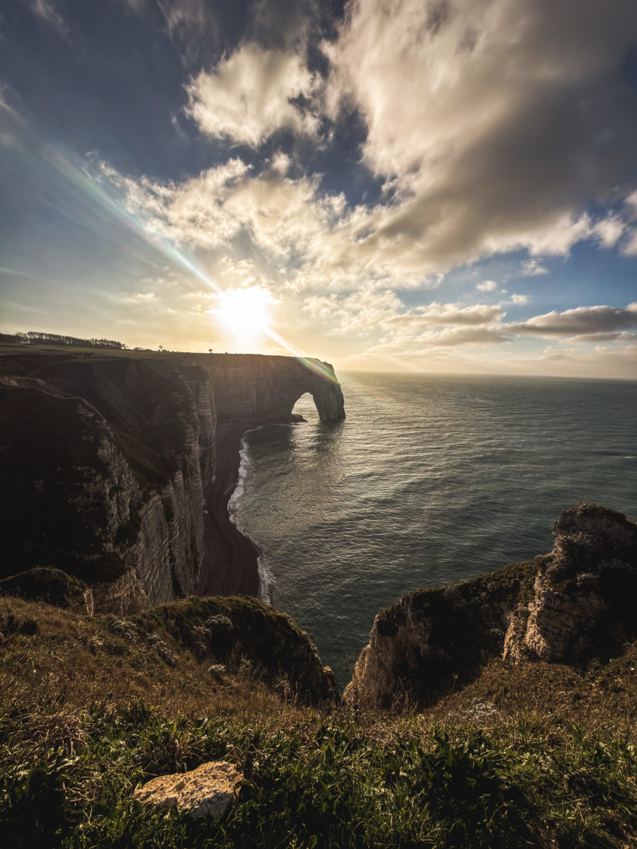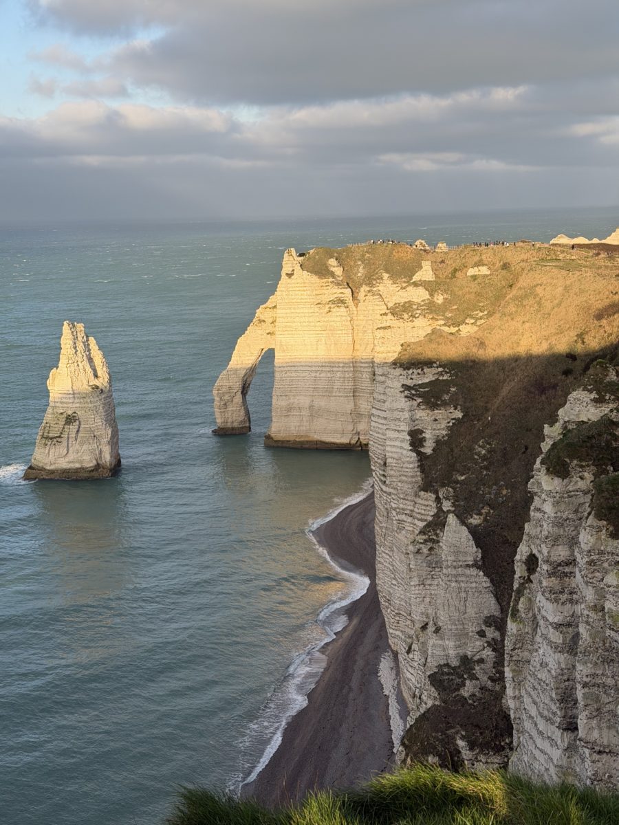 Fortunately, the sun is out. Its light catches the natural arches, the white cliffs, and the deep waters of the English Channel, illuminating the landscape with a golden glow that reminds us why Étretat is so captivating.