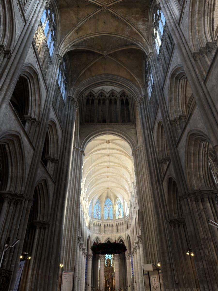 Pourtant, c’est un autre lieu, plus intime et profondément symbolique, qui retient particulièrement mon attention : la place du Vieux-Marché. C’est ici que Jeanne d’Arc fut exécutée en 1431. Aujourd’hui, la place est dominée par l’église Sainte-Jeanne-d’Arc, construite en son honneur. Son architecture moderne contraste avec le reste de la ville, mais touche par sa sobriété. Les vitraux, provenant de l’ancienne église Saint-Vincent, y diffusent une lumière douce et colorée, presque apaisante. L’agencement du lieu, ouvert et lumineux, invite au recueillement sans lourdeur.