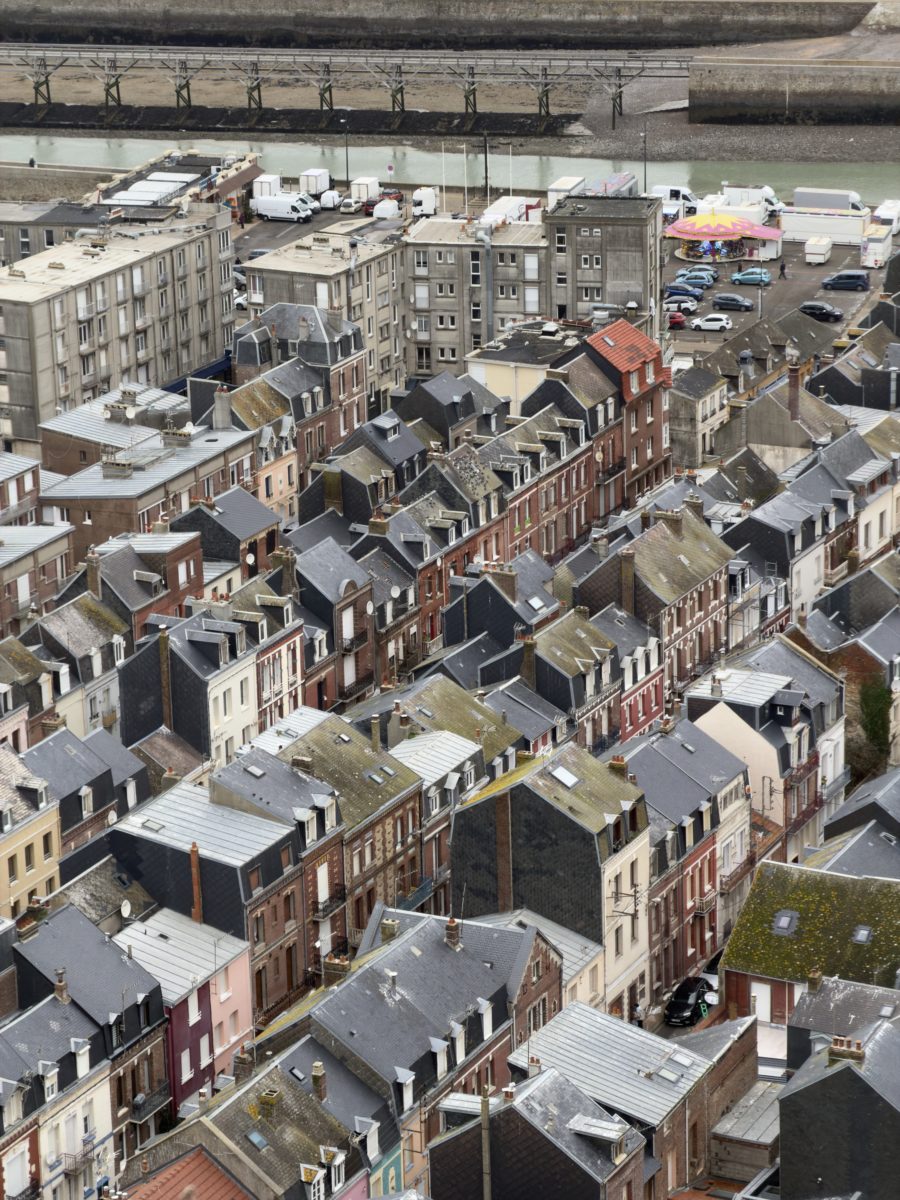 Direction la terrasse panoramique, atteinte en voiture et non à pied, ni par le funiculaire (faut pas déconner, il fait au moins –10 000). De là-haut, le regard embrasse tout : Le Tréport à nos pieds avec ses belles toitures, Mers-les-Bains en arrière-plan, et même Eu sur le bas côté. Les toits serrés, la plage de galets, l’horizon qui file vers l’inconnu.
