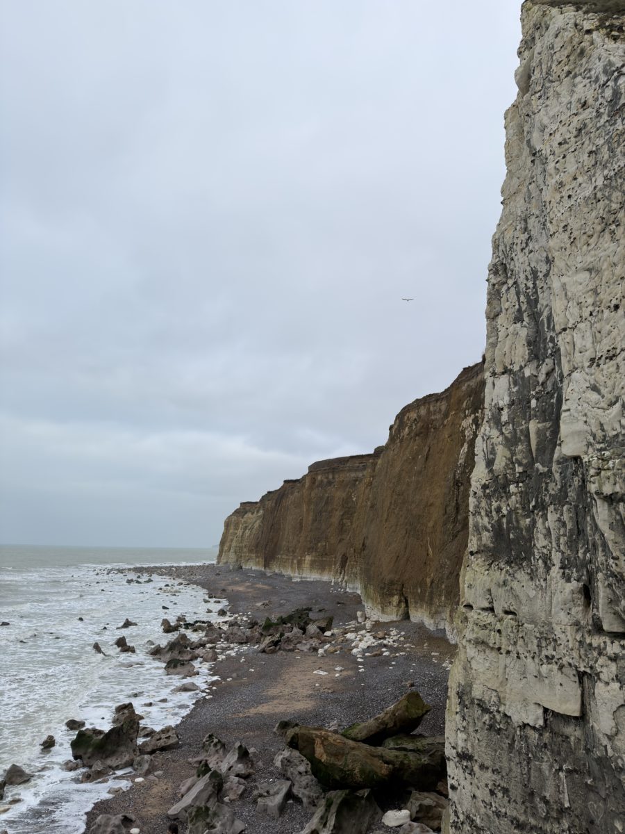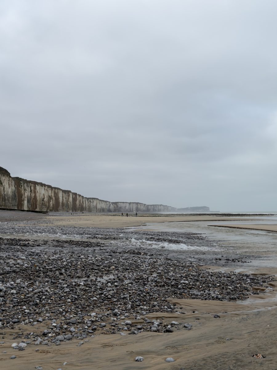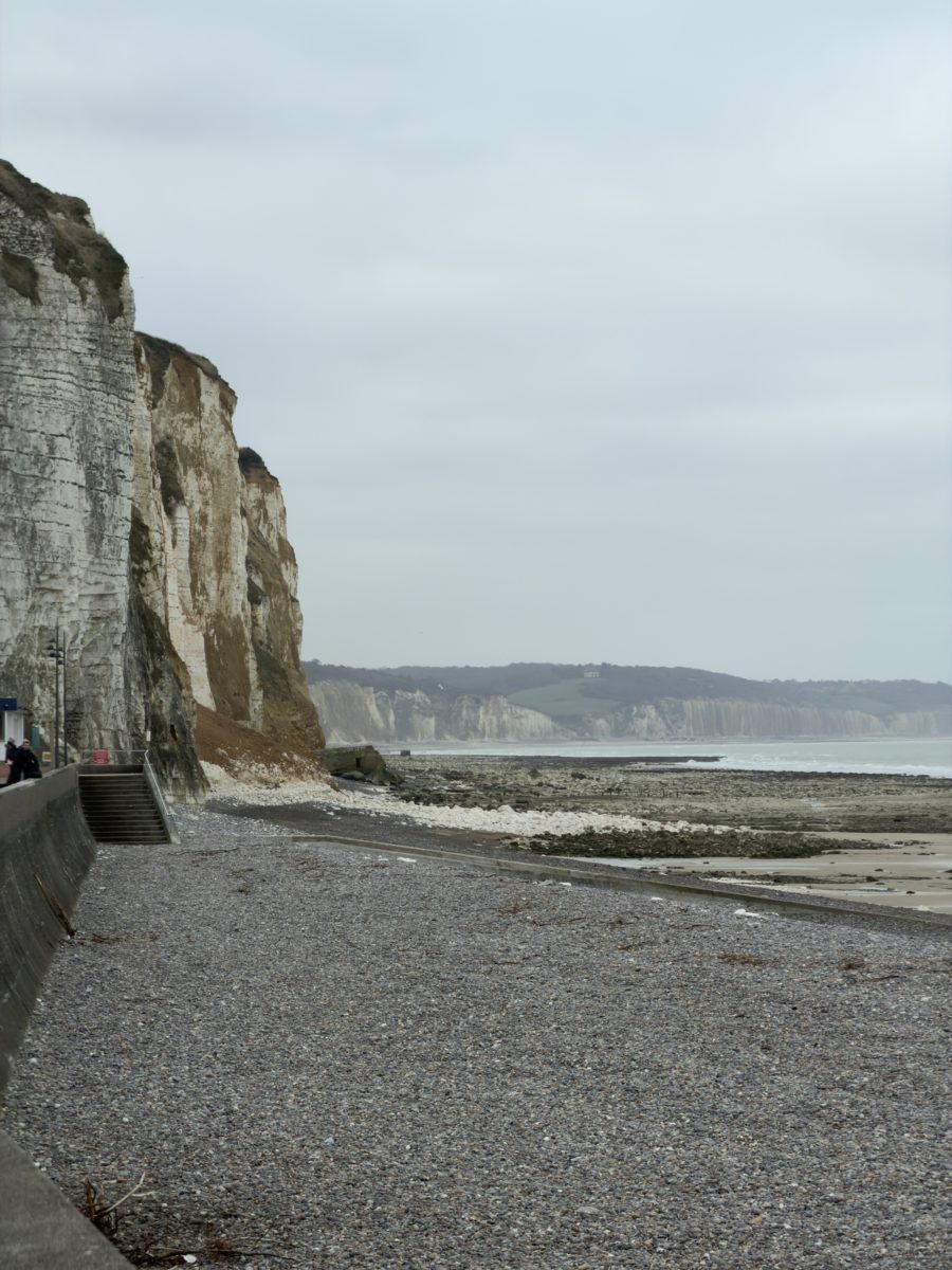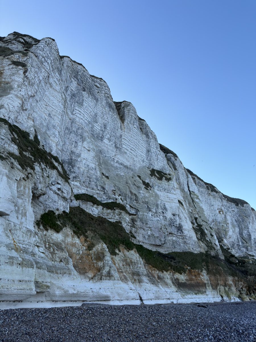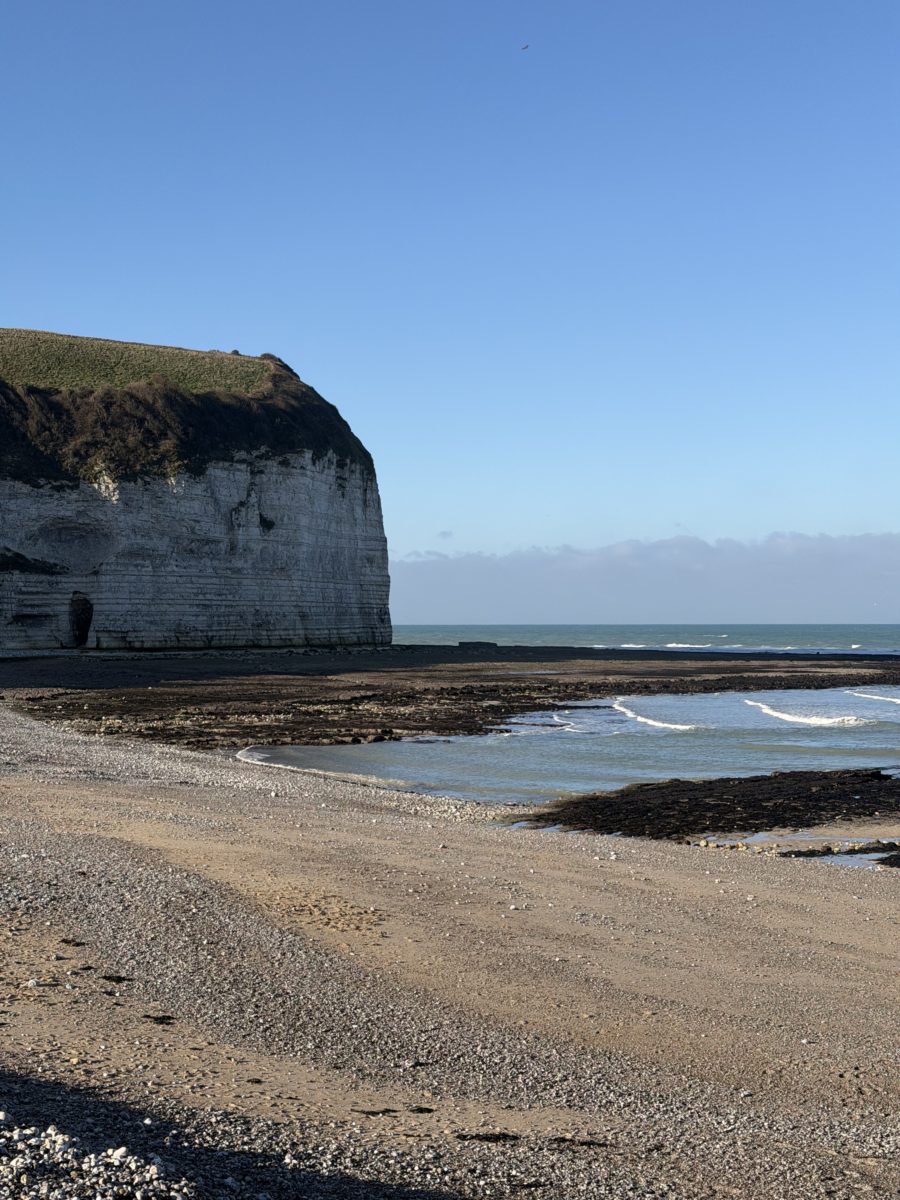 Nous reprenons la voiture en direction de Veules-les-Roses. À l’arrivée, le décor change immédiatement. Ici, les falaises me semblent plus sauvages, plus abruptes. Elles tombent presque à pic vers la mer et donnent d’emblée le ton de la Côte d’Albâtre : brute, verticale, sans compromis. En contrebas, la plage est superbe, large, bordée de galets clairs. Même à marée basse, la mer paraît immense, encore plus vaste au pied de ces parois impressionnantes.