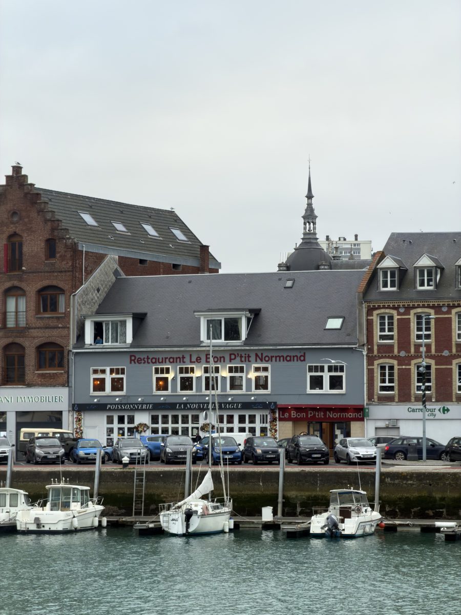 Dieppe se dévoile comme une bourgade pleine de charme, animée par son port vivant, entre pêcheurs, passants pressés et embruns persistants. Et puis, surtout, il y a ce ferry. Mon compagnon s’arrête, captivé, décidé à observer chaque manœuvre, jusqu’à la descente minutieuse des voitures. Impossible de partir avant la fin du spectacle. Mais j’en décide autrement, le froid me congelant sur place.