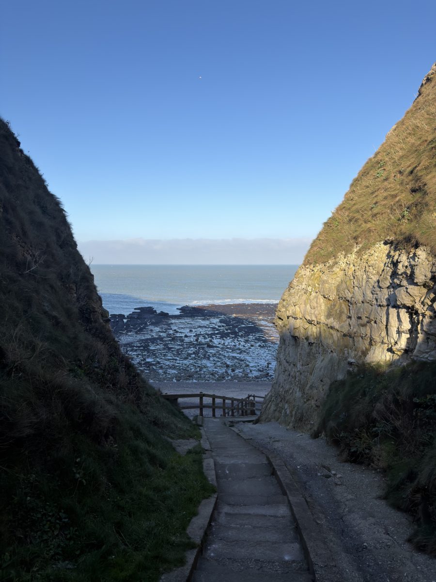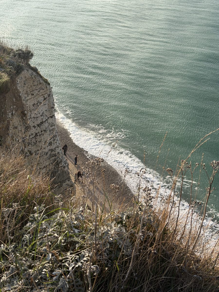 L’escalier renaît en 1954, reconstruit en béton. Aujourd’hui, c’est un long ruban de marches qui s’insinue entre les parois crayeuses, strict, presque monumental. À mesure que l’on descend, la mer se dévoile lentement, par fragments d’horizon. Chaque palier rapproche du rivage et rappelle, en creux, la rudesse de l’histoire autant que la puissance intacte des falaises.