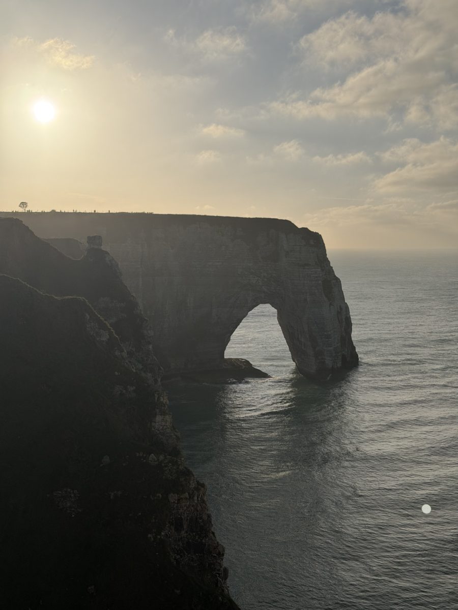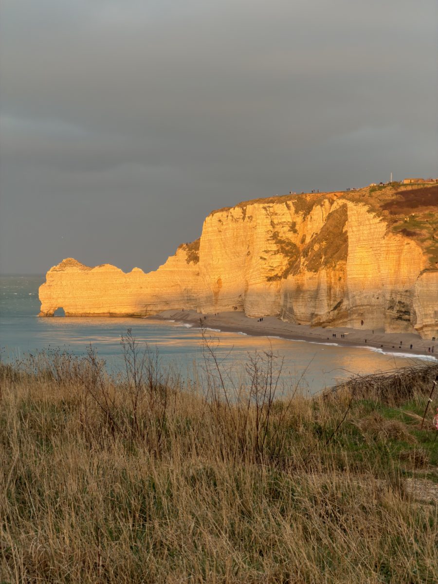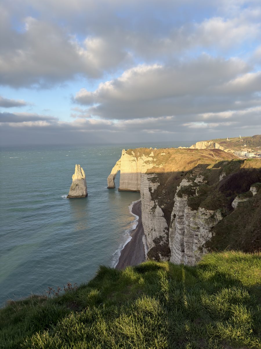 Heureusement, le soleil est de la partie. Il vient accrocher sa lumière aux arches naturelles, aux falaises blanches, aux eaux profondes de la Manche, illuminant le paysage d’un éclat doré qui rappelle pourquoi Étretat fascine tant.
