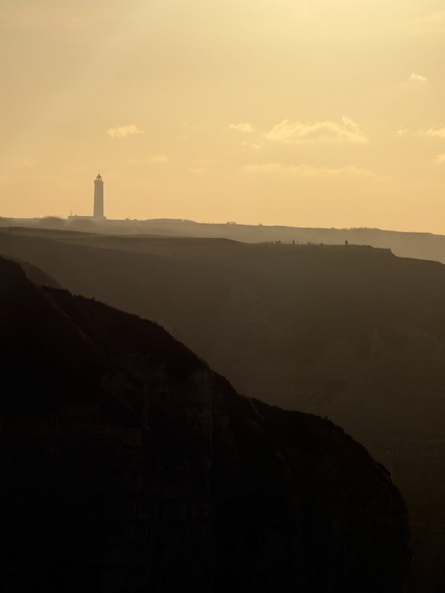 Le lendemain, cap sur La Poterie-Cap-d’Antifer. Nous avançons vers le phare d’Antifer, qui se dresse fièrement, sentinelle immuable face à l’immensité de la mer. Ce jour-là, la Manche est d’un calme presque irréel, une surface lisse et paisible, comme figée dans le temps, contrastant avec le souffle vif du vent froid qui, sans ménagement, s’engouffre dans nos vêtements et décoiffe nos cheveux.