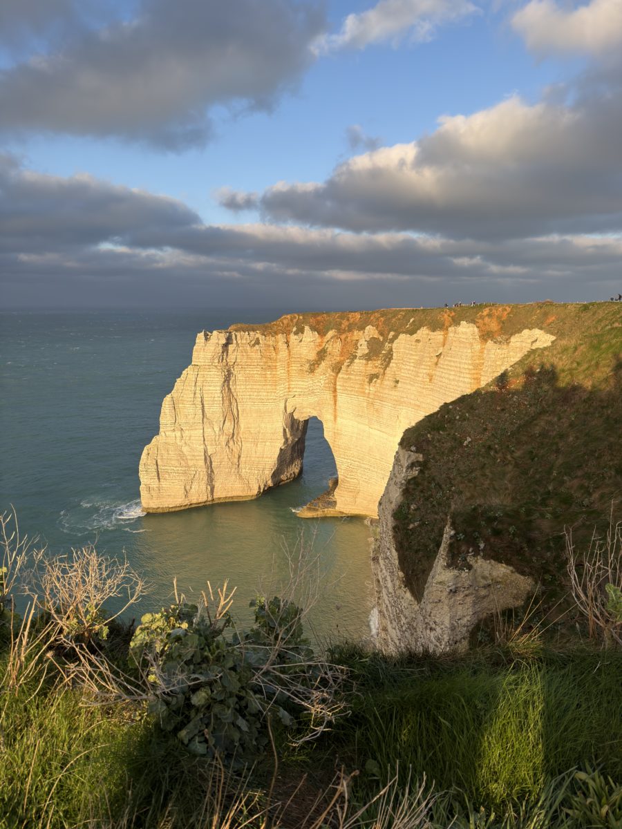 Et puis, Étretat. Ce lieu que je rêvais de voir, de ressentir depuis longtemps. Un nom qui évoque immédiatement ses célèbres falaises de craie blanche, ses arches sculptées par la mer, notamment la fameuse Porte d’Aval et l’Aiguille, silhouette emblématique qui se dresse vers le ciel. La commune, avec ses quelque 1 200 habitants, vit au rythme des visiteurs et visiteuses venus du monde entier, séduits autant par la beauté brute du site que par ses liens avec la littérature et la culture. En effet, qui n’a jamais entendu parler d’Arsène Lupin, le gentleman cambrioleur, dont plusieurs aventures se déroulent ici ou des célèbres peintures de Boudin et Monet ?