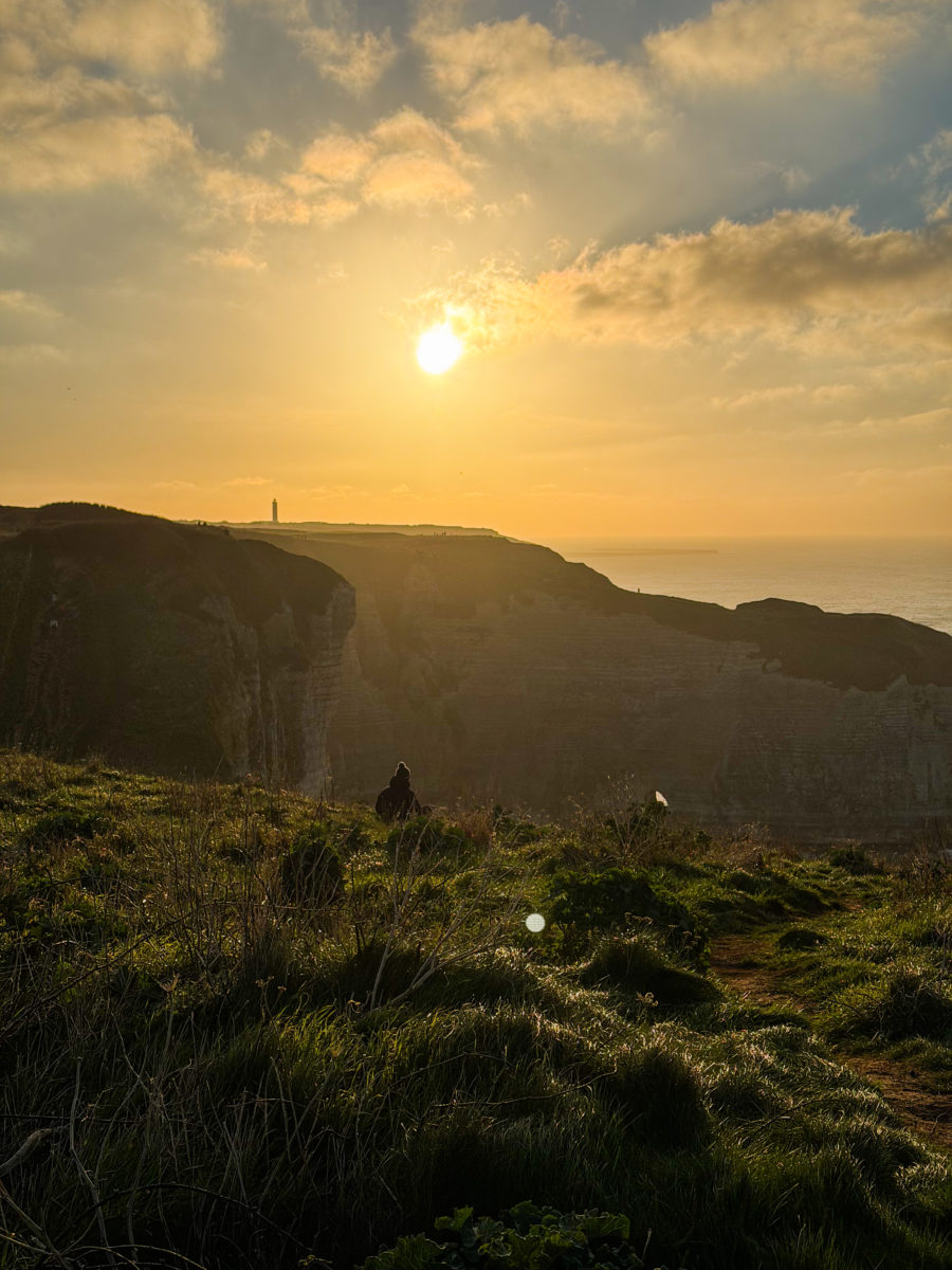 Le sentier du GR21, qui serpente jusqu’à Étretat, nous tend les bras, mais nous choisissons de rester là, à contempler cet horizon infini où ciel et mer semblent se confondre. Un moment suspendu, empreint de silence et de question.