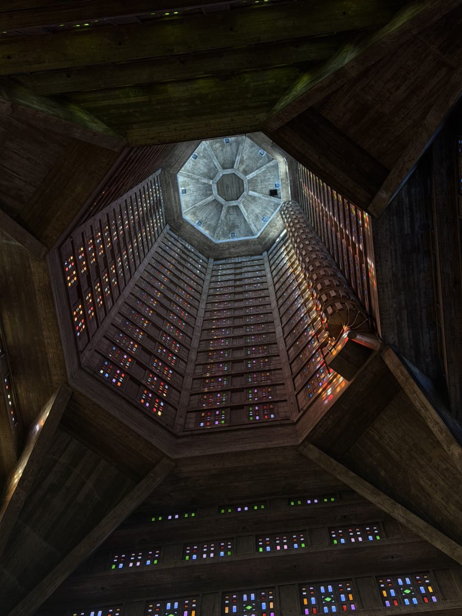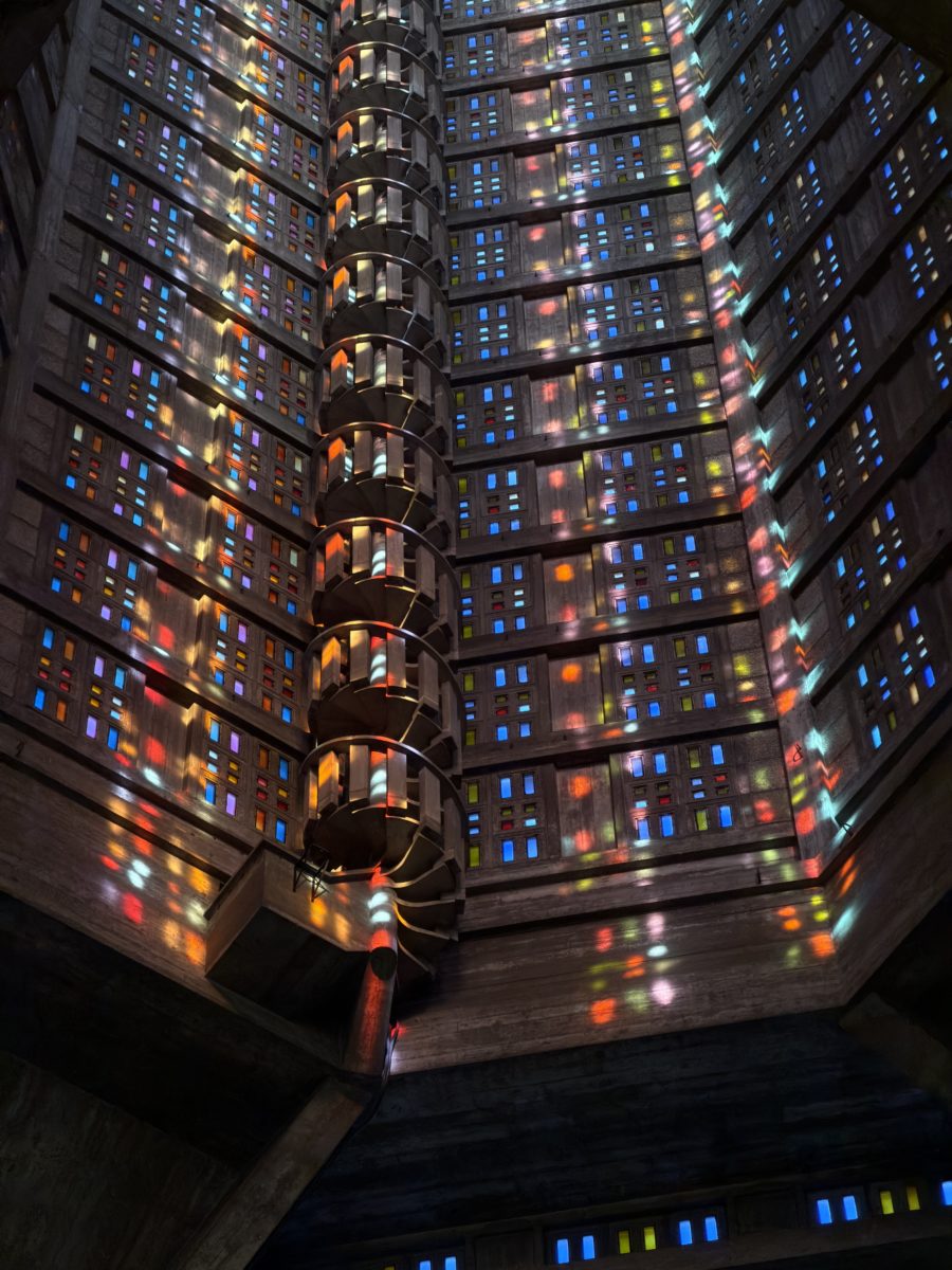 Ces vitraux diffusent une atmosphère changeante et vibrante, où les murs se parent de nuances chatoyantes au fil de la journée. Chaque rayon de soleil semble danser sur ces fragments de verre, conférant au lieu une aura quasi mystique, en contraste avec le béton de l’église.