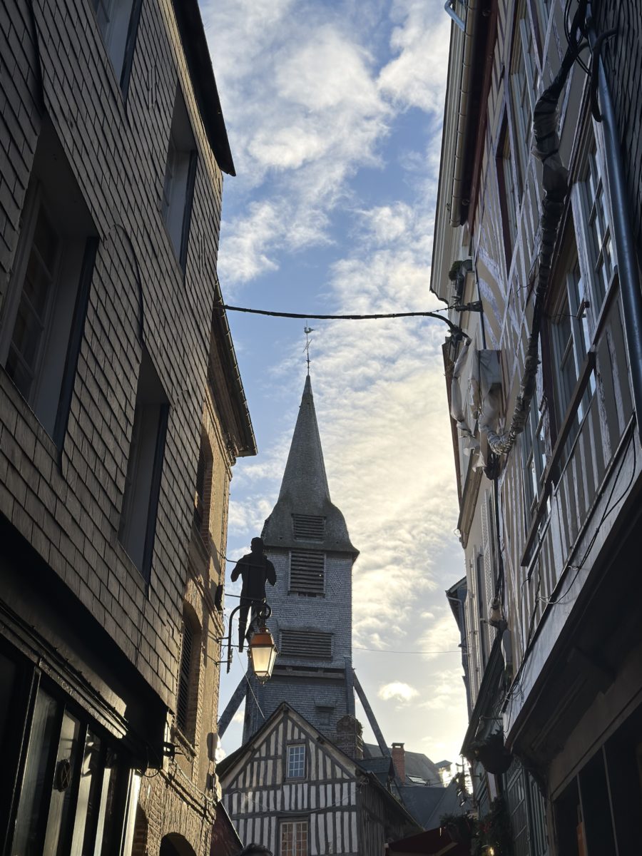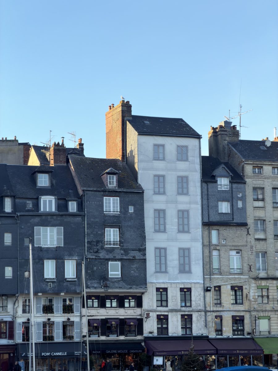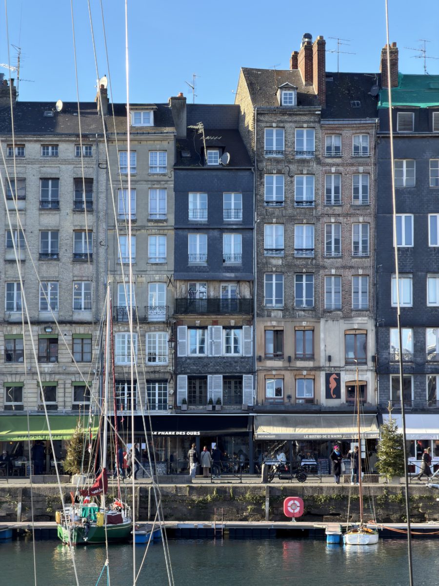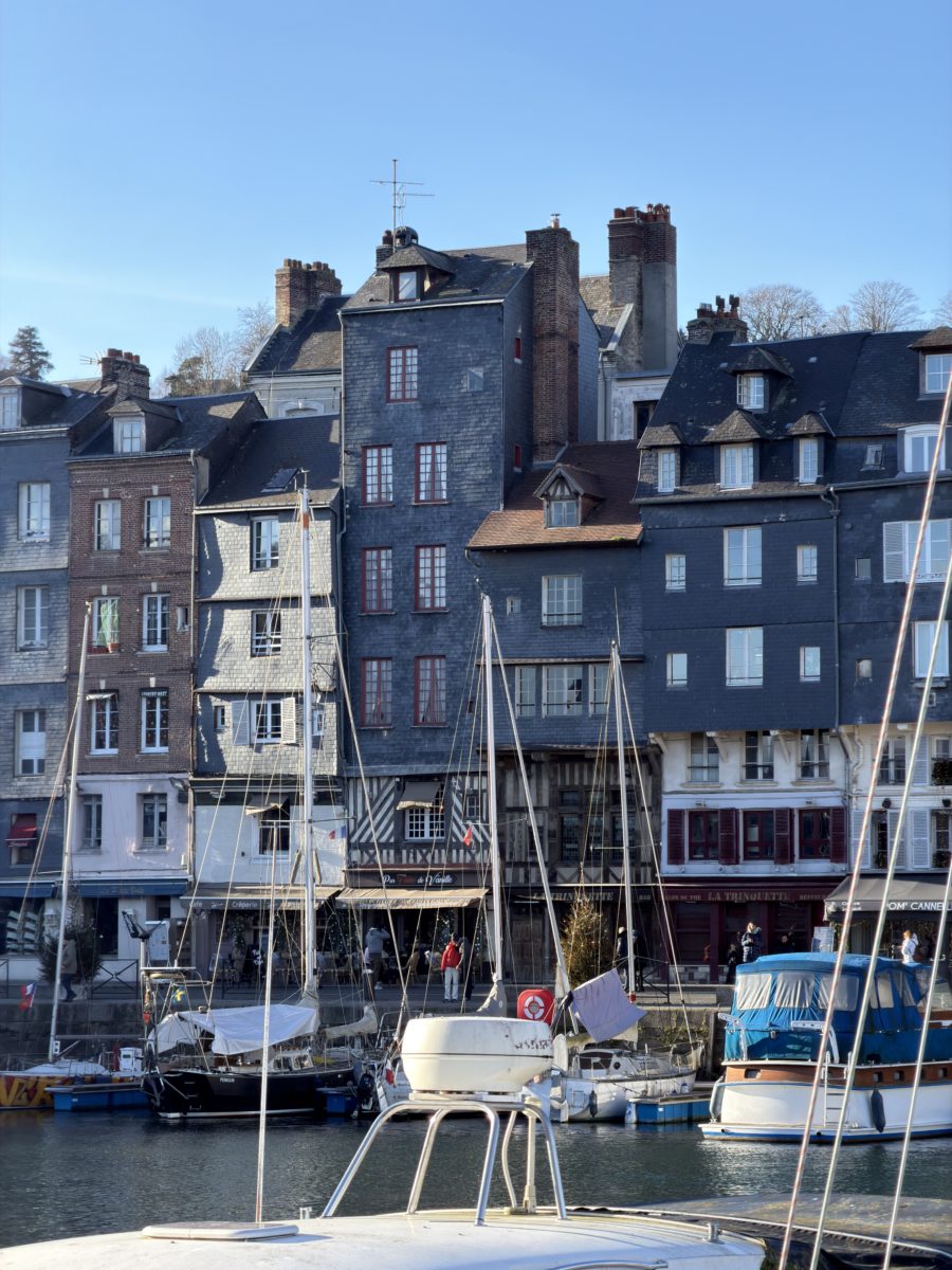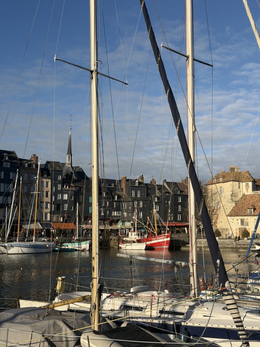 Honfleur nous séduit dès nos premiers pas. Nous nous garons sur un parking situé à quelques pas de l’attraction phare de Honfleur : son Vieux-Bassin. Autour de celui-ci, les hautes maisons aux façades étroites se reflètent dans l’eau calme, comme un tableau vivant.